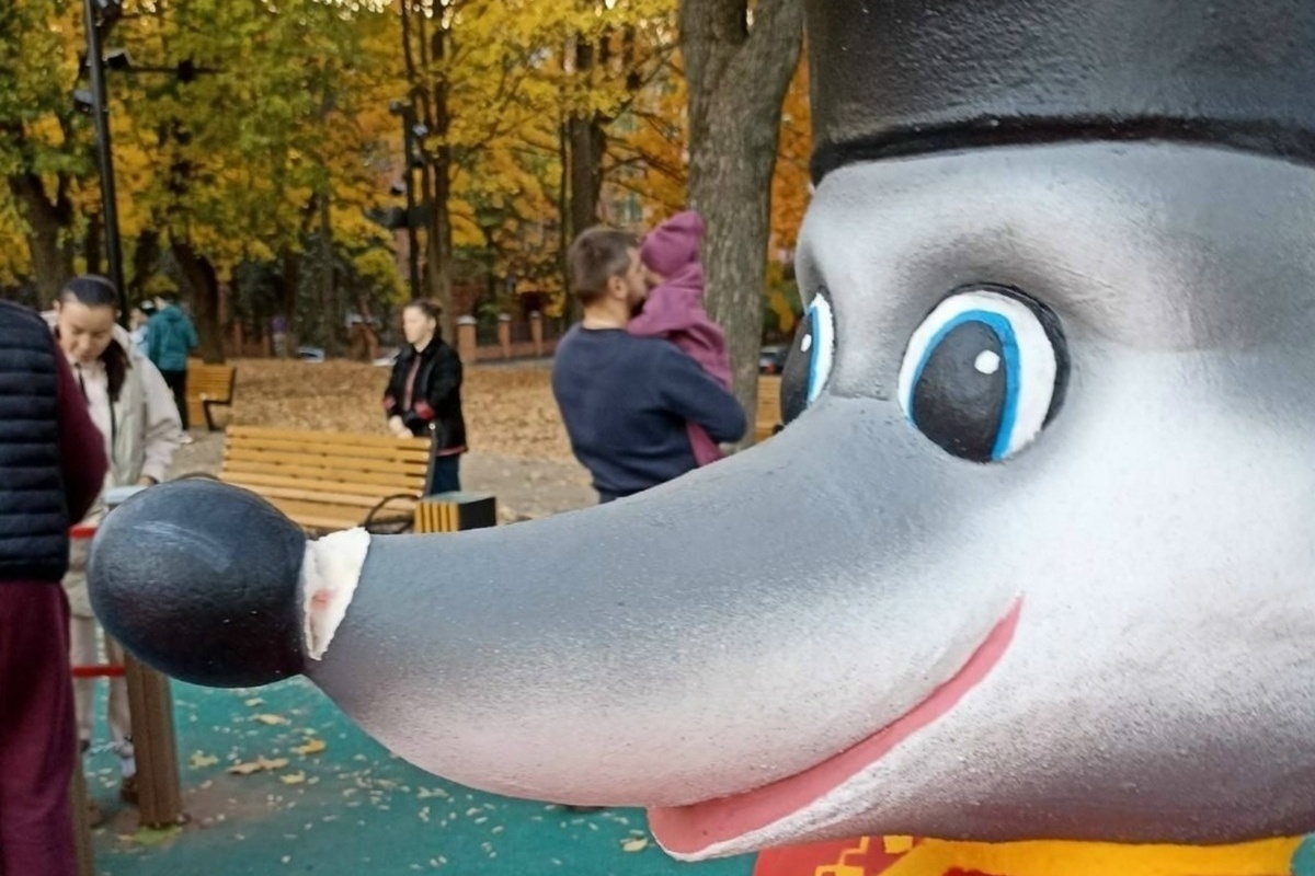 На изображении скульптура волка, но без носа. Неизвестные злоумышленники оторвали его. Также от вандалов досталось скульптуре колобка.
